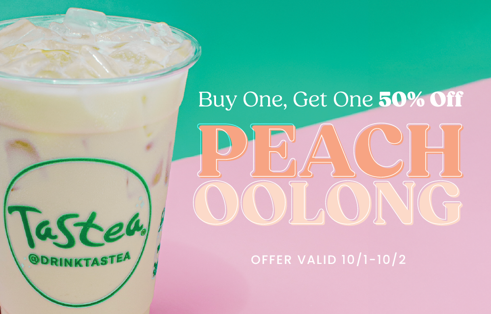 We love you OOLONG time!🍑 Buy one, get one 50% off a 20oz Peach Oolong Milk Tea!🧋 ❗Valid 10/1 - 10/2/25 at ALL Tastea locations❗