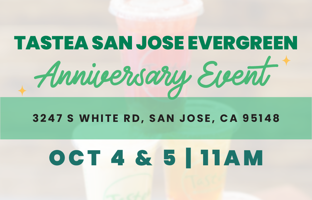 Start the coundown! Tastea Evergreen's Anniversary is on Saturday, 10/4/25 🎊 Thank you to the Evergreen community for supporting us throughout the years! 💚 🗓 October 4-5, 2025 ⏰ Doors Open 11 AM 📍 3247 S White Rd, San Jose, CA 95148 ✨ TASTEA MERCH ✨